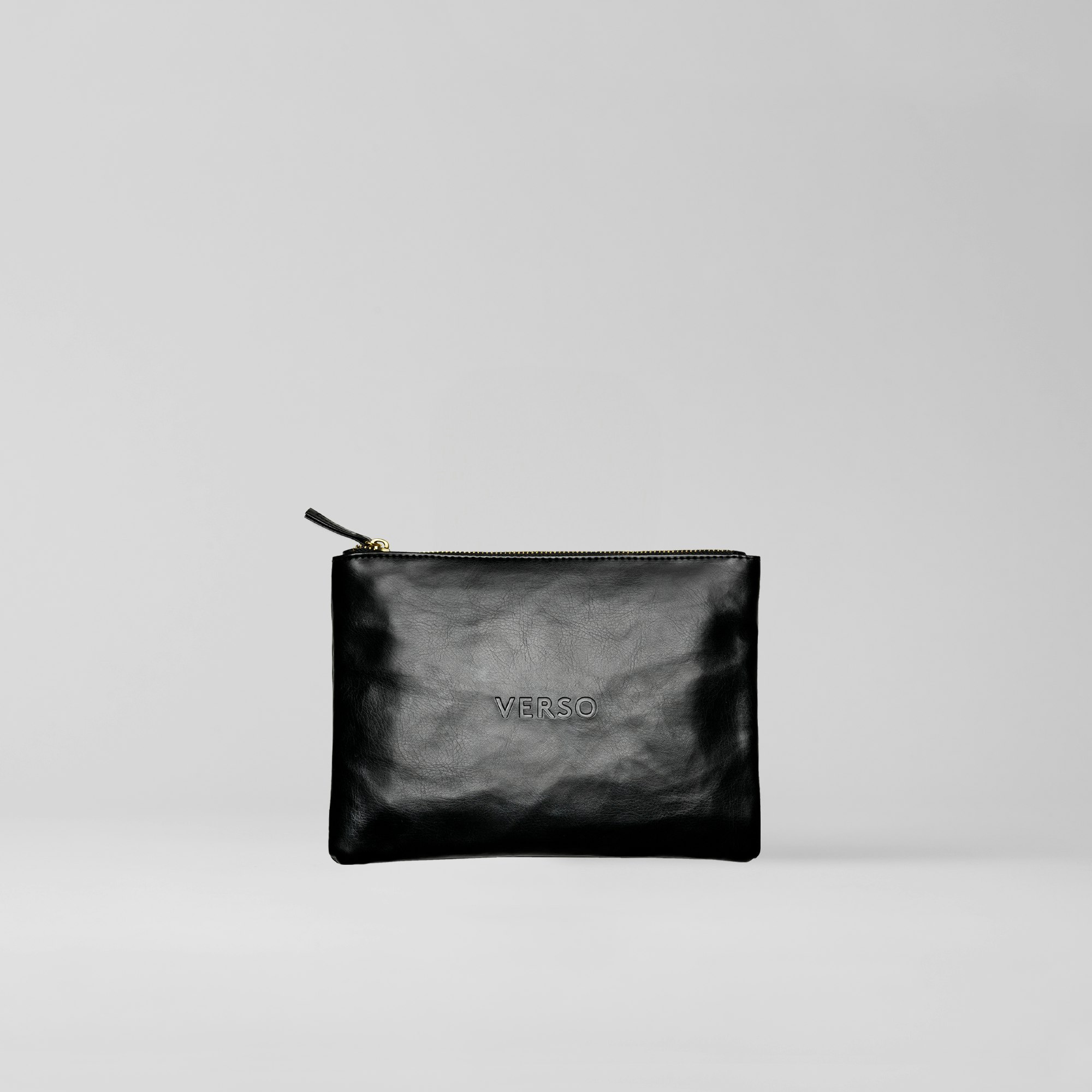 Our sleek and exclusive black toiletry bag, crafted from high-quality vegan leather for a luxurious yet sustainable look. Perfectly sized for both travel and everyday use, this bag ensures you can stylishly store your Verso essentials or any other toiletries with ease. The elegant gold zipper adds a touch of sophistication, making this toiletry bag as functional as it is fashionable. Compact enough to fit in any bag while still providing ample space for your essentials.